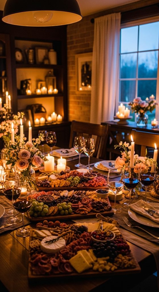 Decor Tip: Use wooden boards, elegant glassware, and candlelight to create a cozy, upscale feel. String lights can add charm if the event continues into the evening.