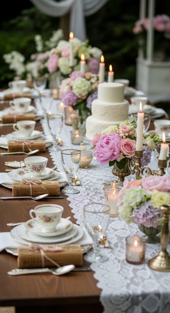 Decor Tip: Stick to muted tones, pastel colors, and floral patterns. Small details like doilies, old silverware, and vintage serving trays make the theme feel authentic.