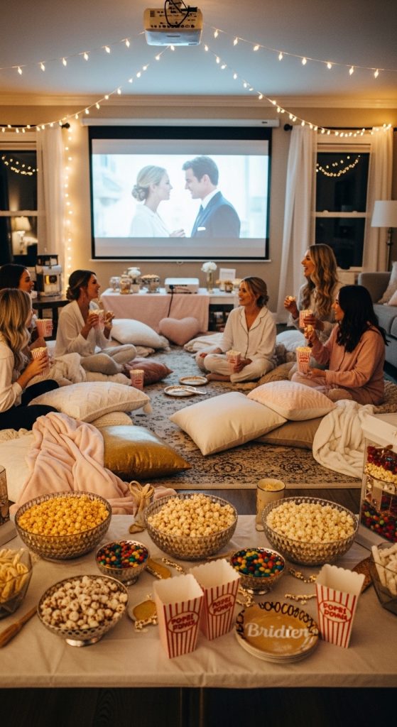 Decor Tip: Set up a projector for a cinematic experience and use string lights to create a warm, inviting glow. Personalized popcorn boxes with the bride’s name add a charming touch.