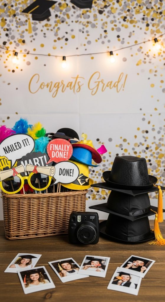 Create a dedicated photo area with a stylish backdrop, fun props, and good lighting. Include items like graduation caps, oversized glasses, speech bubbles with inspirational phrases, and props representing the graduate’s major or hobbies.