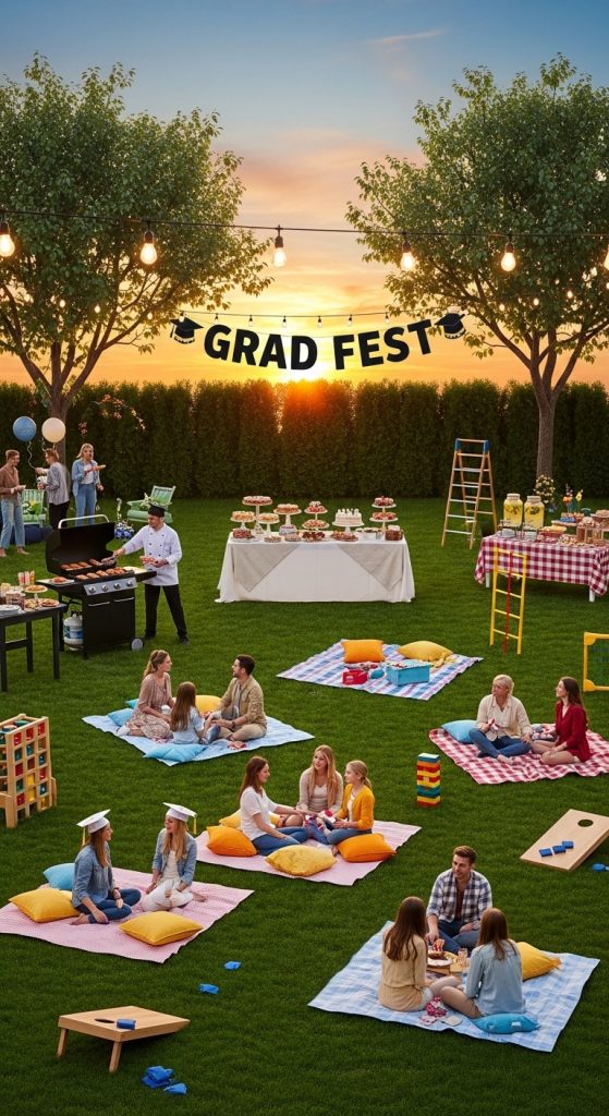 Turn your backyard into a mini festival complete with string lights, picnic blankets, food stations, and a curated playlist. You can even create a custom party name, like “Grad Fest 2026,” and design simple wristbands or badges for guests.