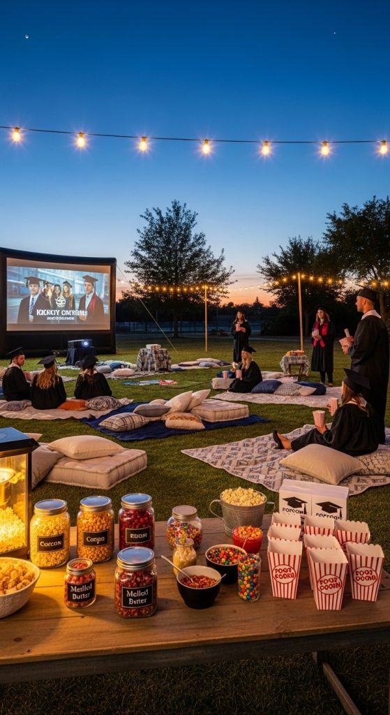 Set up a projector and large screen in the backyard for an outdoor movie night. Feature the graduate’s favorite film or create a short custom video montage highlighting college memories.