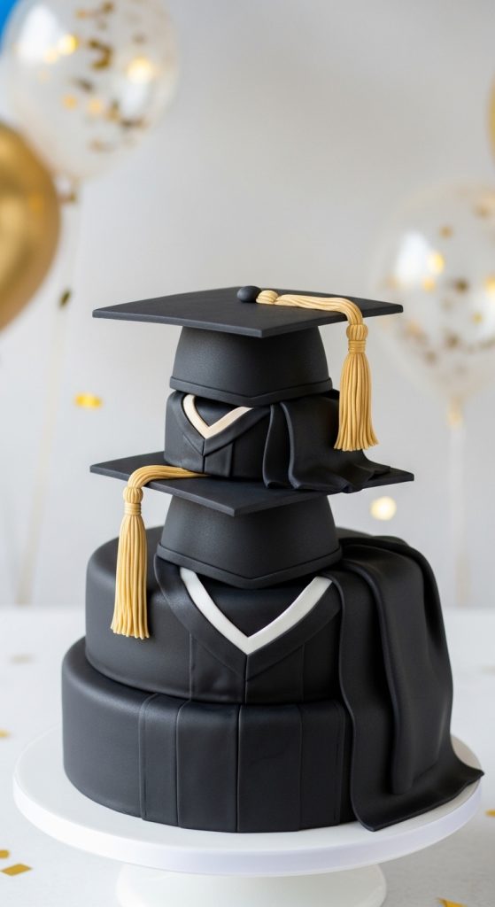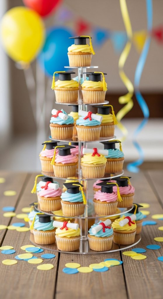 If you prefer cupcakes to a large cake, consider creating a cupcake tower featuring mini graduation hats. Each cupcake can be decorated with a small fondant mortarboard, and the tower itself can be arranged in the shape of a larger cap or the graduate’s initials. Cupcake towers are fun, interactive, and allow guests to take home their own piece of the celebration.