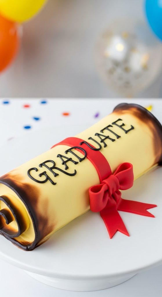 For a creative twist on tradition, consider a cake shaped like a rolled diploma scroll. This design can be done in fondant or buttercream, with realistic details like ribbons and writing. It’s a unique way to symbolize academic achievement and makes for an impressive photo opportunity. You can even customize it with the graduate’s school colors for extra flair.