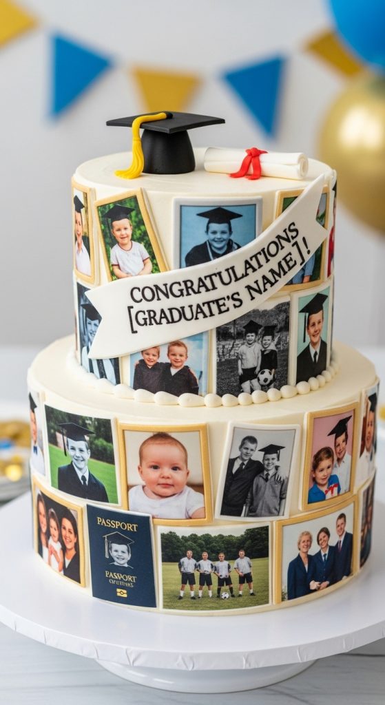 Make your cake a trip down memory lane by creating a photo collage design. Edible images of the graduate from kindergarten to the present can be placed on the cake layers. This idea works wonderfully for family celebrations, showing the growth and achievements of the graduate. Pairing the images with personalized messages or quotes adds an emotional touch that guests will love.