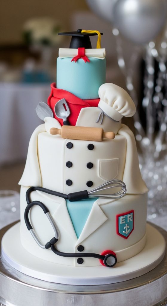 If the graduate has chosen a specific career path, why not design the cake around their future profession? For example, a medical school graduate might enjoy a cake decorated with a stethoscope and lab coat, while a culinary student might have a cake with miniature kitchen tools. Career-themed cakes not only celebrate past achievements but also look forward to the graduate’s bright future.