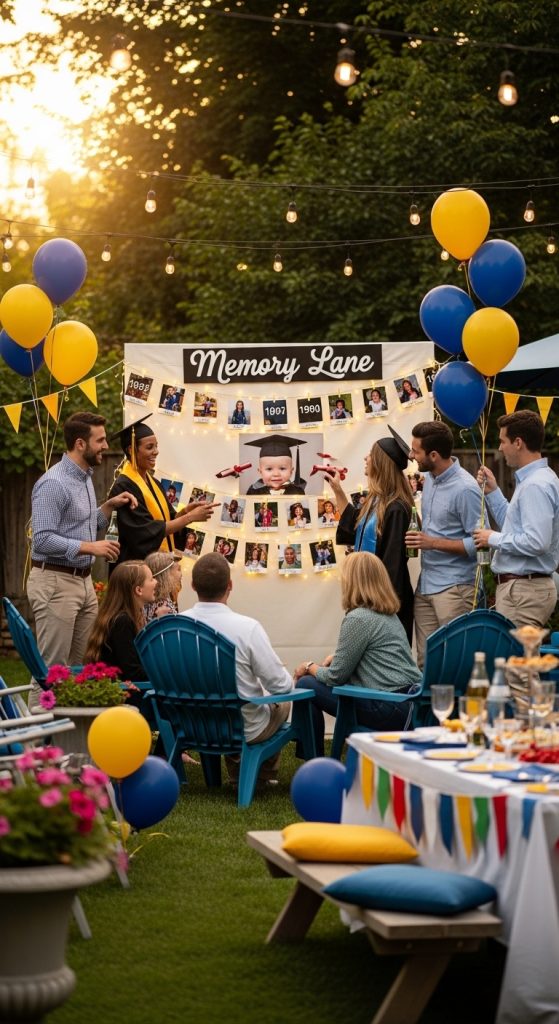 Transform your party space into a visual journey through the graduate’s life. Print photos from childhood through graduation and display them along a timeline on a wall, clothesline, or poster boards. Guests can walk through and see how much the graduate has grown over the years.