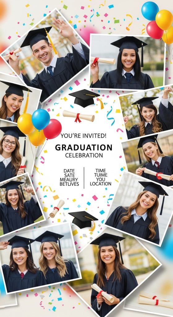 Combine favorite photos of both graduates to create a personalized photo collage. This approach not only adds a personal touch but also allows guests to feel connected to each graduate. You can include baby photos, school memories, and recent achievements. Modern printing services can produce high-quality invitations with a sleek collage effect that looks professional and heartfelt.