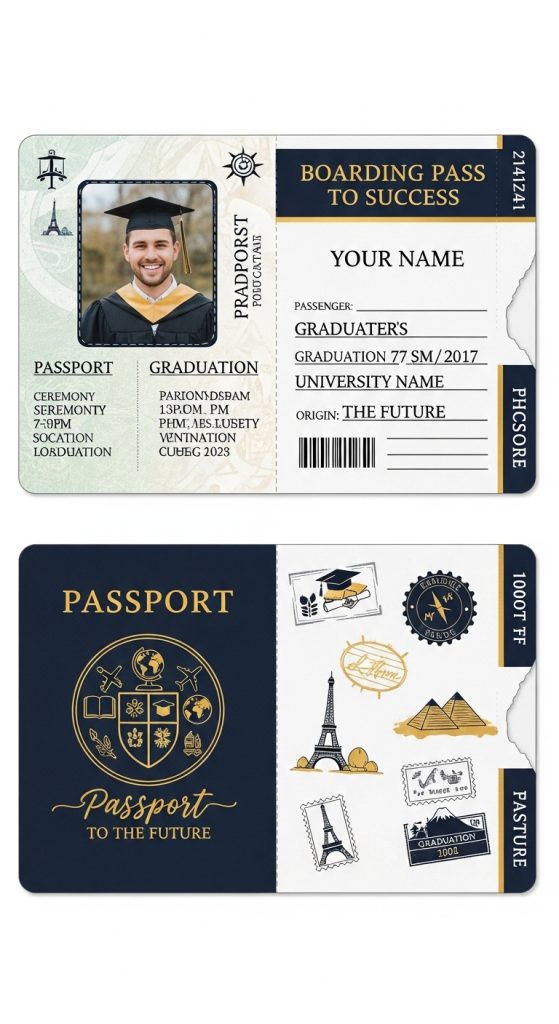 Give your party a global or adventurous theme by designing invitations like passports or boarding passes. Each graduate can have their “own page” within the invitation, complete with their photo, destination (party location), and achievements as “stamps of honor.” This concept is unique and perfect for families or friends who love travel or themed events.