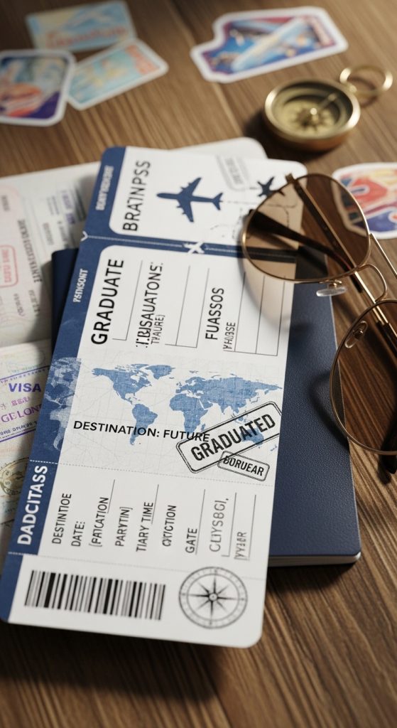 For graduates moving to a new city or country, a travel-themed announcement is perfect. Design your card to resemble a passport or boarding pass with details like: