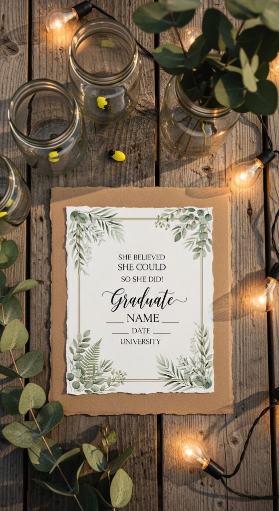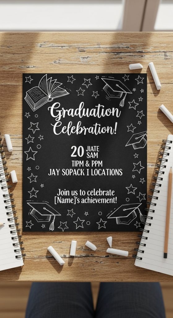 Celebrate your academic journey with a classroom-inspired design. Use chalkboard-style fonts, doodles of books, diplomas, and graduation caps.