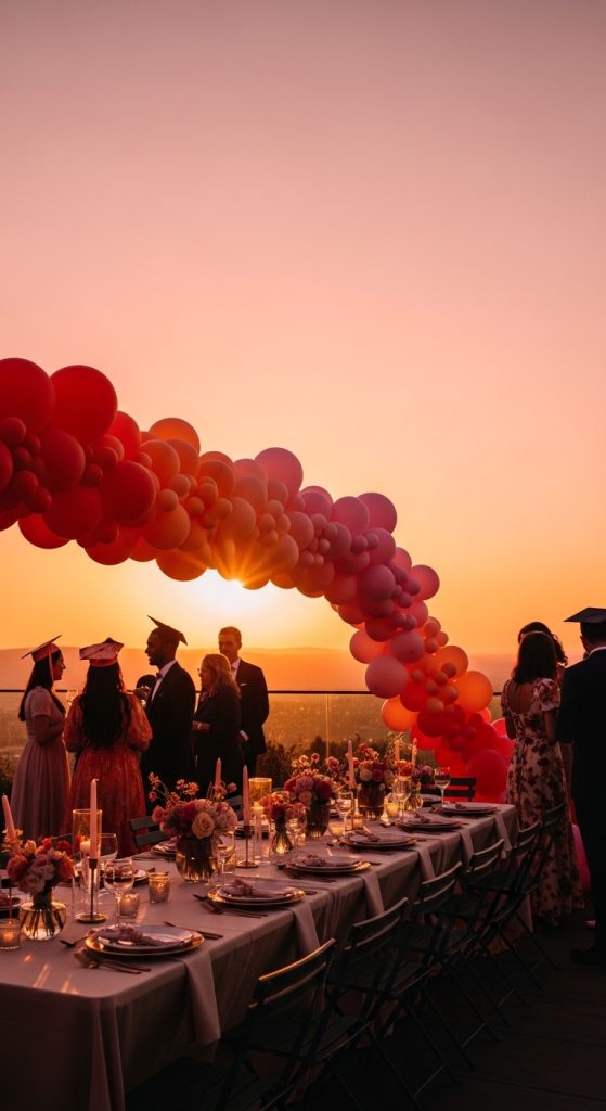 Capture the beauty of a new chapter with a sunset-inspired ombré palette featuring shades of coral, peach, pink, and soft orange. Blend these hues throughout your decor, from balloon garlands to table linens. This theme is perfect for outdoor parties held in the late afternoon or early evening. As the sun sets, the natural lighting enhances the gradient colors and creates magical photo opportunities. It symbolizes endings and beginnings in the most poetic way.