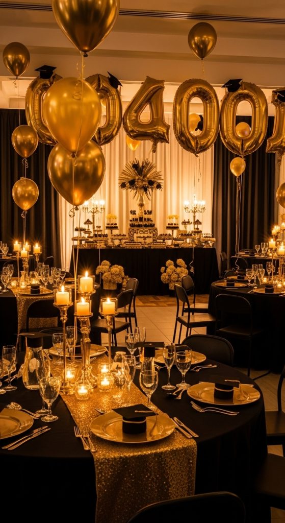 Black and gold is a timeless graduation favorite. The black represents the traditional graduation cap and gown, while gold adds a sense of luxury and accomplishment. This combination works beautifully for both indoor and evening celebrations. Think black tablecloths with gold runners, metallic balloons, gold confetti, and candlelight for a sophisticated glow. Add personalized gold lettering on signage or dessert tables to elevate the look even more. This theme feels formal, polished, and celebratory all at once.