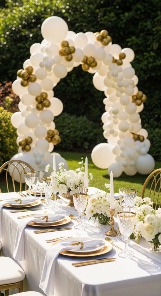 For a clean and upscale look, white and gold creates a bright, celebratory atmosphere. White symbolizes new beginnings, while gold adds sparkle and warmth. Use white linens, gold-rimmed plates, and crystal-clear glassware for a refined setting. Balloon arches in white and gold make stunning entryways or photo areas. This palette is ideal for brunch-style graduation parties or garden gatherings where natural light enhances the airy aesthetic.