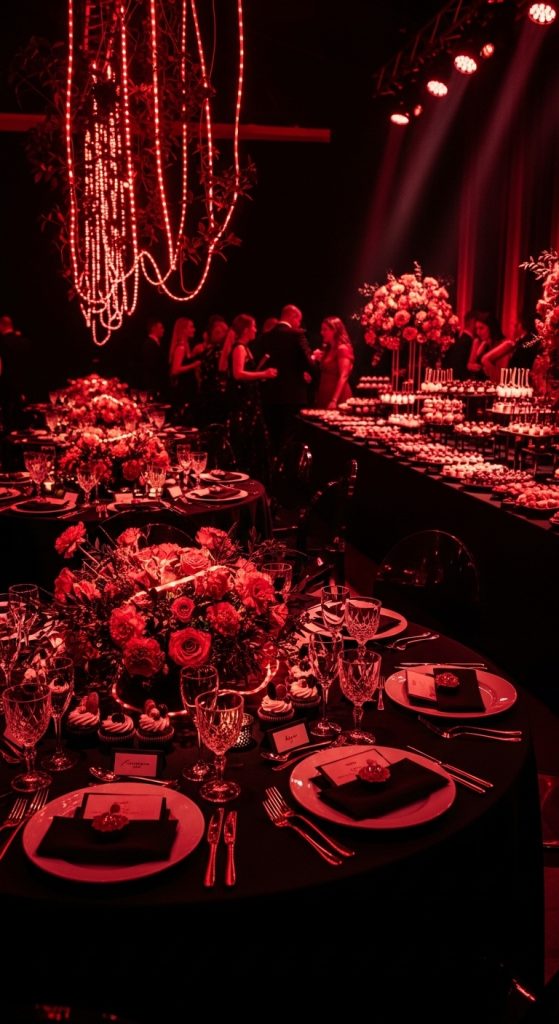 Red and black make a powerful, high-energy combination. Red brings excitement and passion, while black grounds the design with sophistication. This palette is perfect for graduates who want something dramatic and eye-catching. Consider red floral centerpieces against black table settings, red velvet cupcakes, and LED lighting to amplify the mood. It’s a great option for evening celebrations or parties with a DJ and dance floor.