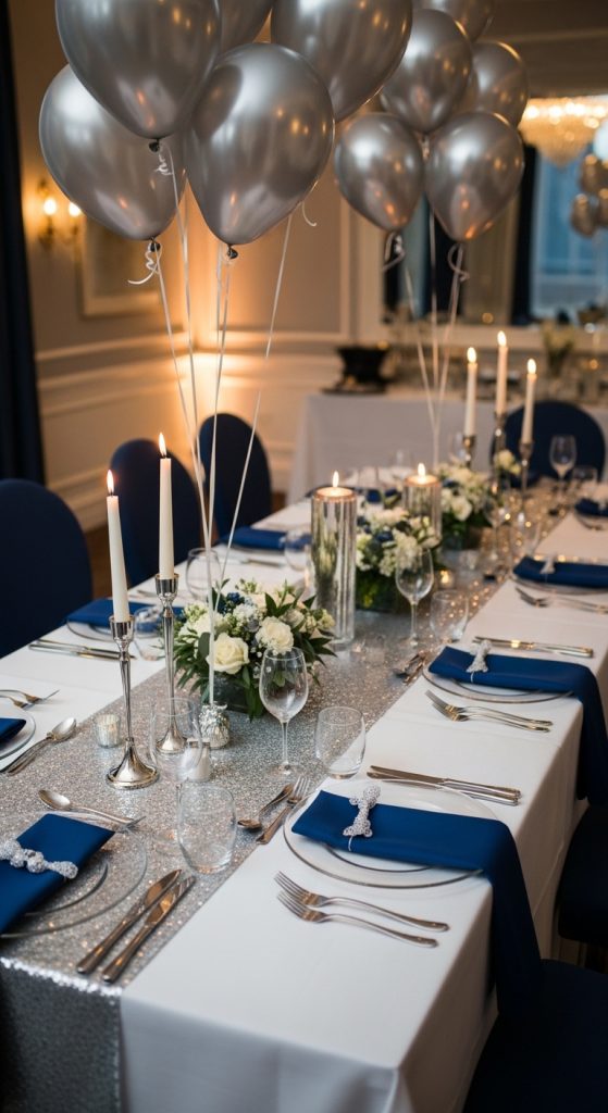Navy and silver combine depth with shine. Navy offers a classic foundation, while silver adds a modern touch. This color scheme works well for both casual and formal gatherings. Incorporate silver sequined table runners, navy napkins, and metallic balloons. String lights or silver lanterns enhance the overall ambiance. This palette strikes a balance between bold and elegant, making it a versatile choice.