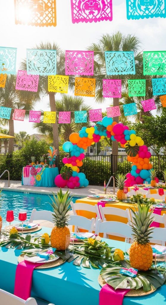 For a fun and energetic graduation party, consider tropical-inspired colors like hot pink, turquoise, bright yellow, and orange. This palette is perfect for summer graduates or poolside parties. Use colorful tableware, vibrant floral arrangements, and fruit-inspired decorations like pineapple centerpieces. Add a bright balloon arch or a tropical photo booth backdrop for a festive vibe. This theme celebrates not just graduation, but also the excitement of what’s ahead.