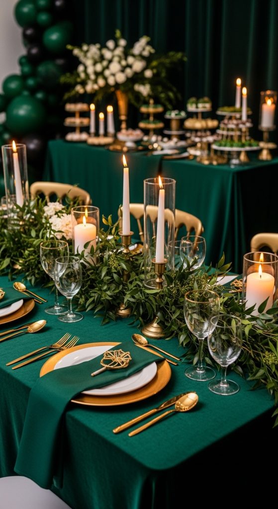 Emerald green paired with gold creates a rich and luxurious aesthetic. The deep green symbolizes growth and success, while gold highlights achievement. This combination works beautifully with velvet tablecloths, gold-framed signs, and lush greenery accents. Add candles and gold flatware for a glamorous finish. Emerald and gold is ideal for evening garden parties or elegant indoor venues.