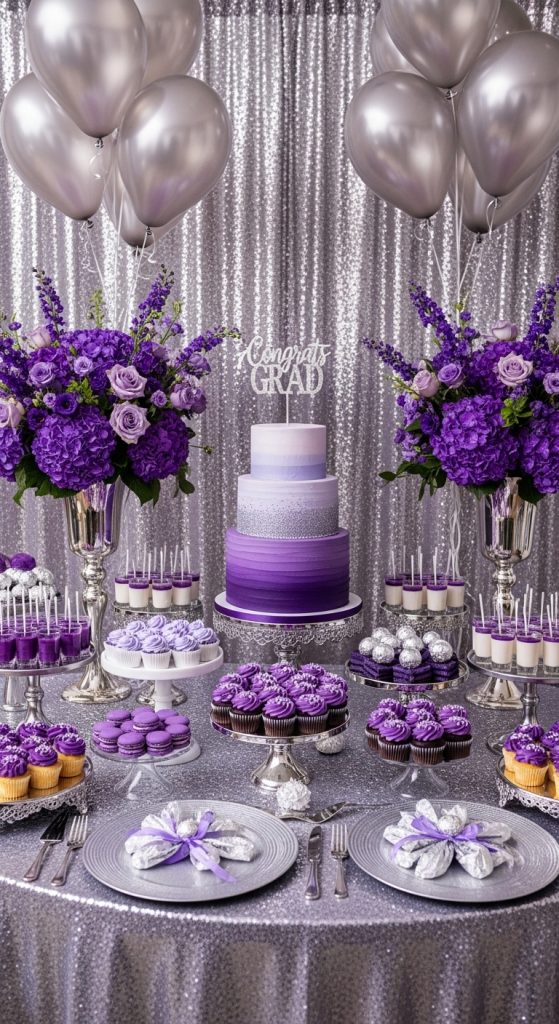 Purple represents ambition, creativity, and pride—qualities many graduates embody. When paired with silver, it creates a regal and celebratory atmosphere. Decorate with purple floral arrangements, silver balloons, and shimmering table accents. This palette works especially well for themed photo booths or dessert tables with ombré purple cakes and treats. It’s bold without being overwhelming and leaves a lasting impression.
