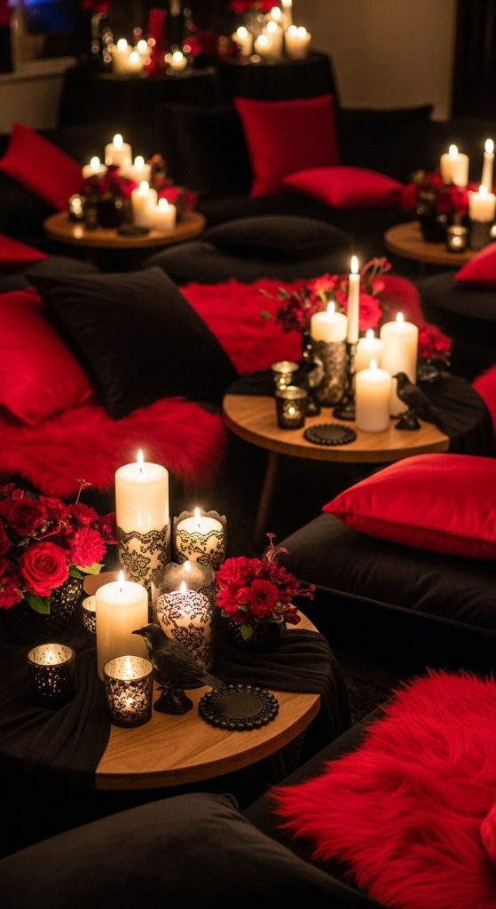 This setup works beautifully for an intimate gathering. Soft background music and cozy seating areas with black velvet cushions and red throws can turn the event into a romantic lounge experience.