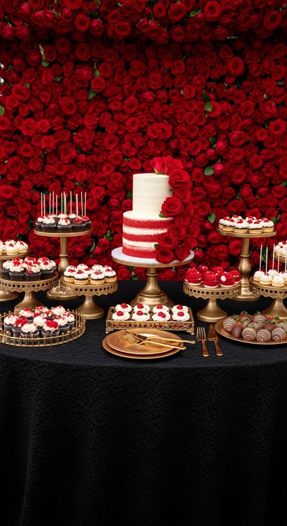 A show-stopping dessert table can instantly set the tone. Use a black tablecloth with red satin runners for contrast. Add a dramatic backdrop featuring cascading red roses against a matte black wall. Incorporate elegant treats such as red velvet cupcakes with black frosting, chocolate-dipped strawberries with red drizzle, and a sleek black cake adorned with deep red sugar flowers.
