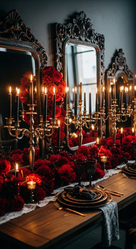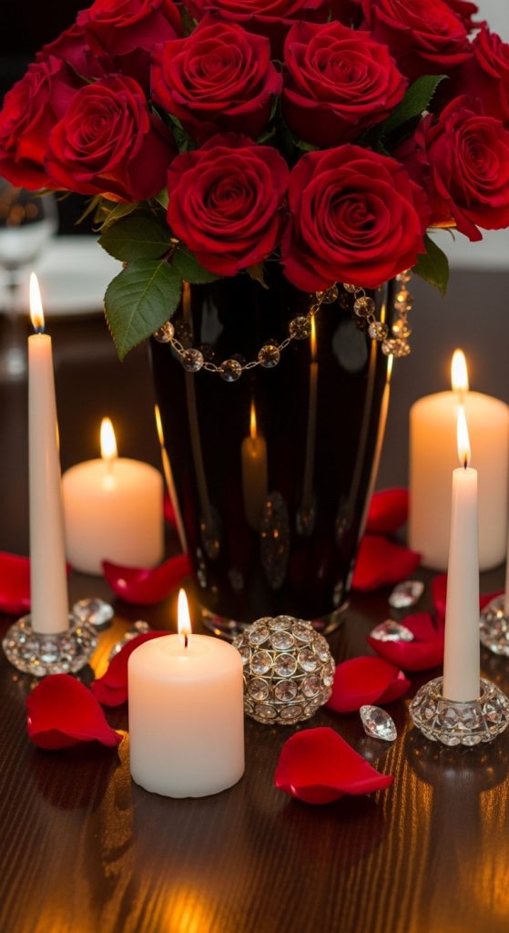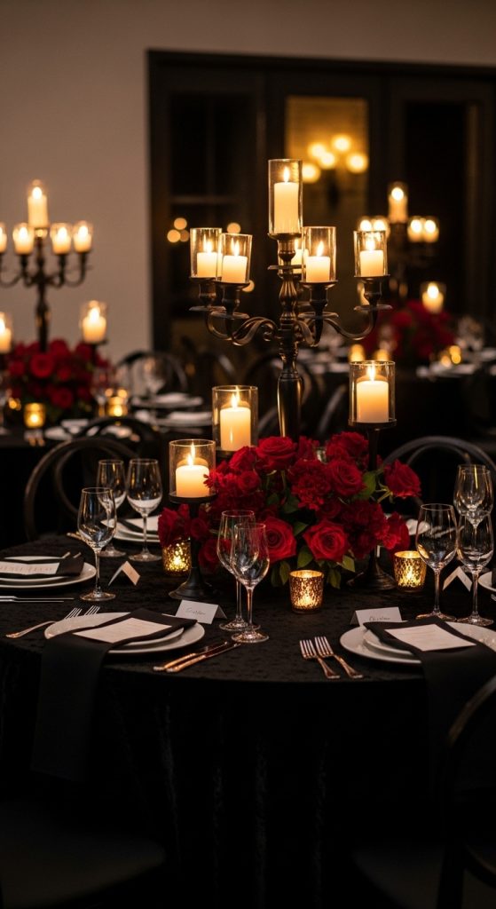 Scatter rose petals across tables and incorporate candlelight to create a romantic glow. Tall centerpieces with red roses and dangling black crystals can elevate the space into something truly enchanting.