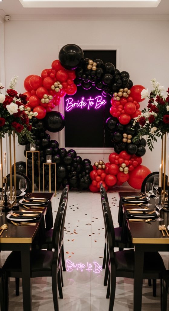 Balloon decor doesn’t have to be childish—it can be incredibly chic. Create a balloon arch using matte black, metallic gold, and deep red balloons. Add touches of greenery or faux roses for texture.