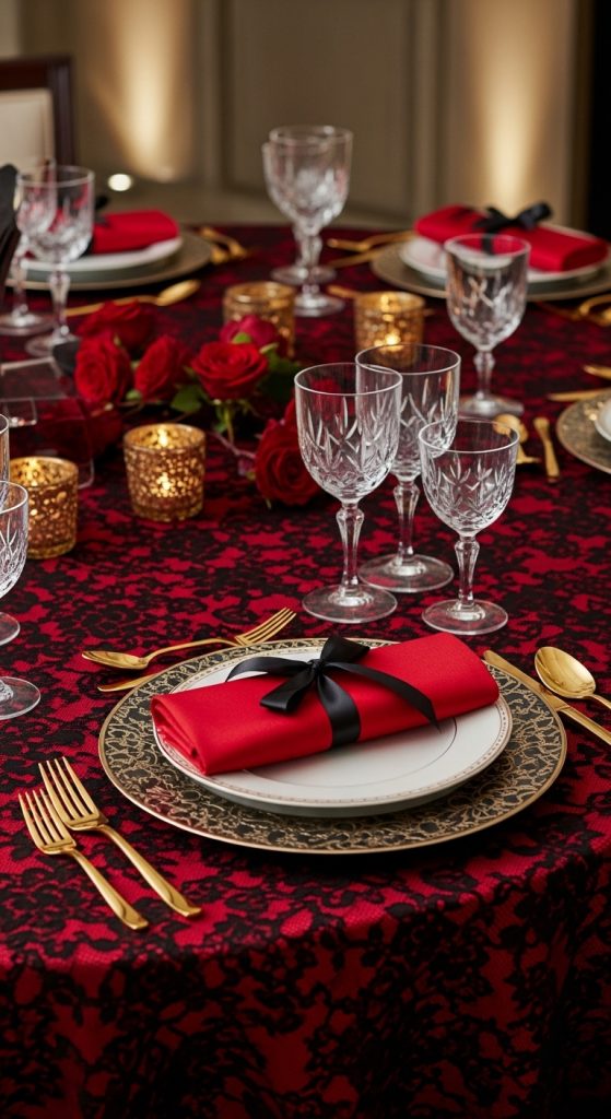 Transform your dining area with black lace table overlays placed on red tablecloths. Use red napkins tied with black ribbon or lace bands. Elegant black dinnerware paired with gold flatware can enhance the luxurious feel.