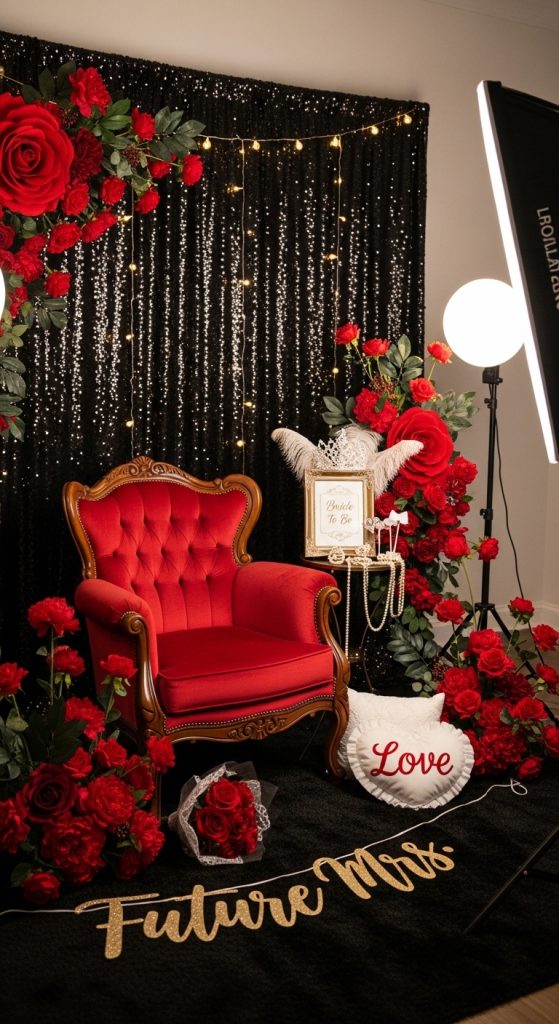 You could even include a vintage-style black chaise lounge or red velvet chair for guests to pose with the bride-to-be. Instant photo prints in black-and-red themed frames make wonderful keepsakes.