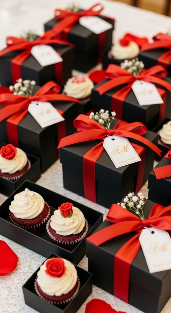 Send guests home with thoughtful themed favors. Ideas include mini red velvet cupcakes in black boxes, black candles tied with red ribbon, or small jars of strawberry jam labeled with romantic quotes.