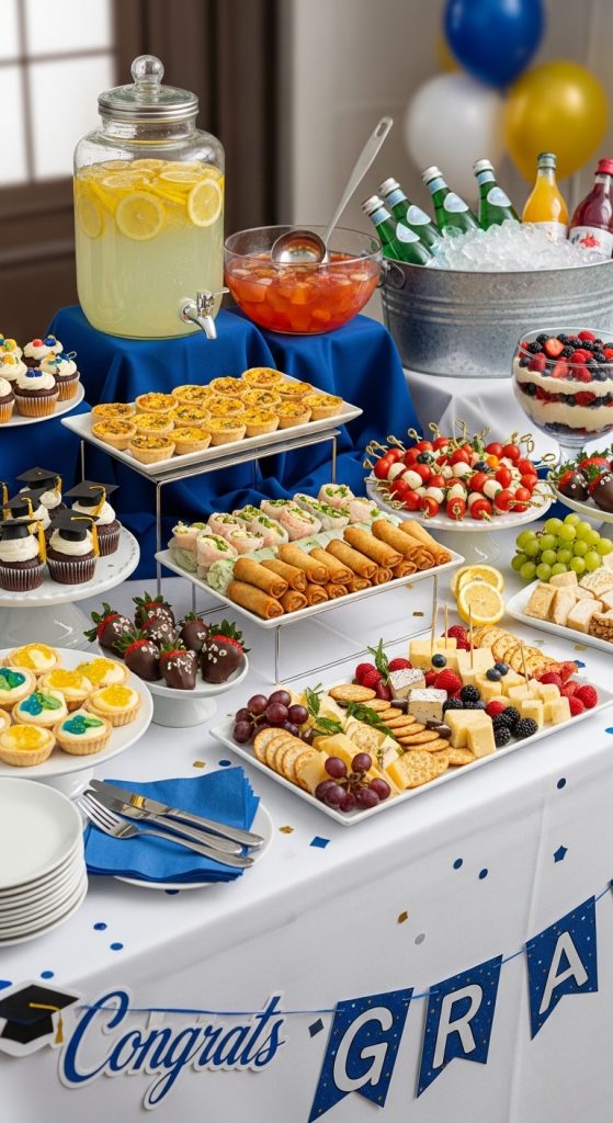 Food is often the centerpiece of any celebration. Choose a menu that accommodates a variety of dietary needs, including vegetarian, vegan, and allergy-friendly options. Finger foods and bite-sized portions work well for mingling, while a buffet allows guests to serve themselves at their convenience. Don’t forget celebratory touches like a cake, cupcakes, or dessert station that ties into the graduation theme. A thoughtful menu shows hospitality and consideration for your guests.