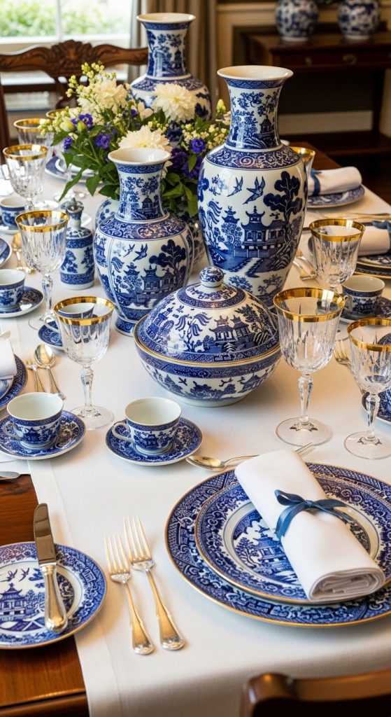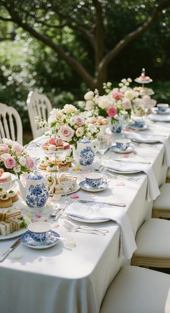 Host an elegant tea party featuring blue floral tablecloths, fine china, and tiered dessert stands. Think delicate teacups, white lace napkins, and pastel-blue accents throughout the room.