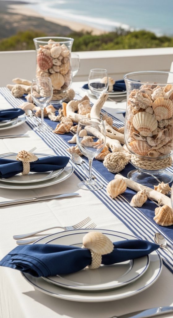Channel seaside charm with navy stripes, rope accents, and seashell décor. Think of the breezy elegance of Cape Cod or Nantucket. Use striped table runners, anchor motifs, and driftwood centerpieces.