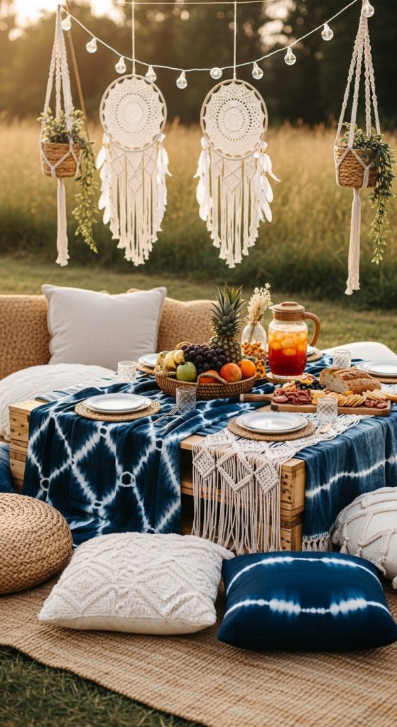 Combine the calm of blue tones with bohemian textures. Layer white macramé table runners over blue linens and incorporate rattan chargers and woven baskets. Accent with indigo throw pillows for lounge seating areas.