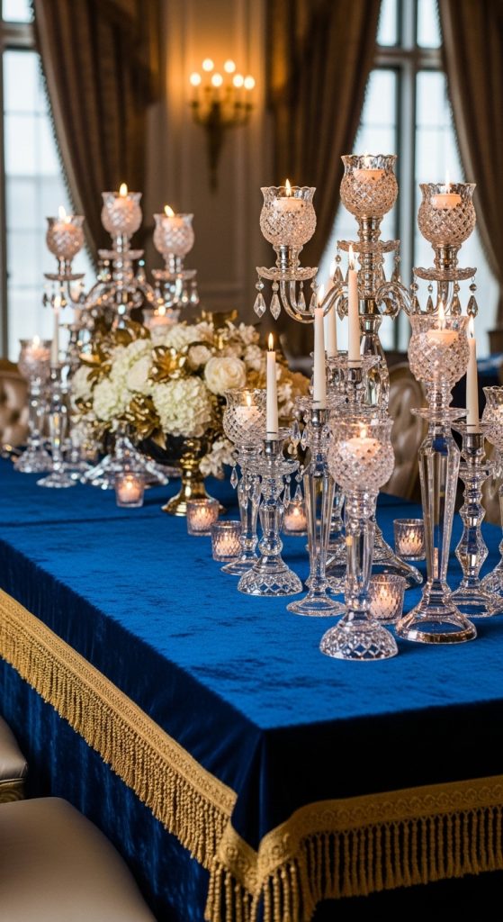 Elevate the celebration with rich royal blue paired with crisp white and metallic accents. Velvet tablecloths, crystal candleholders, and dramatic floral centerpieces create a luxurious ambiance.