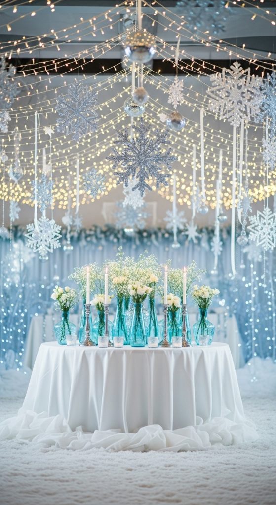 If the bridal shower takes place during cooler months, a blue-and-white winter theme is magical. Incorporate icy blue hues, faux snow accents, and white fairy lights. Silver snowflake décor and mirrored trays add sparkle.