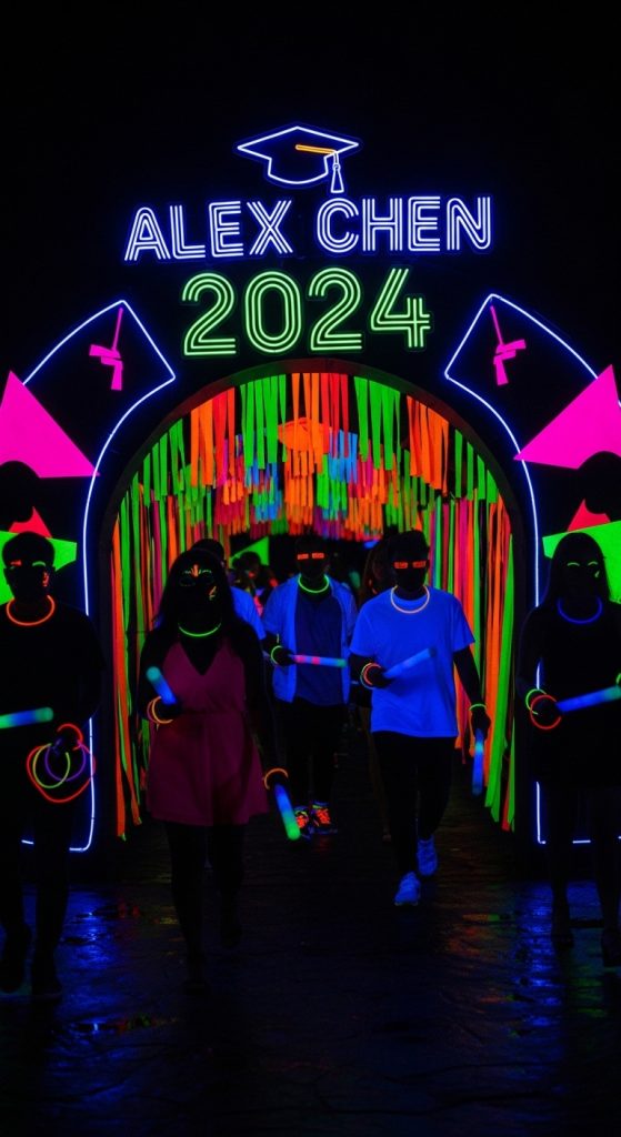 If your graduation party is in the evening, a glow-in-the-dark entrance can create an unforgettable vibe. Use black lights, neon signs, and glow sticks for guests.
