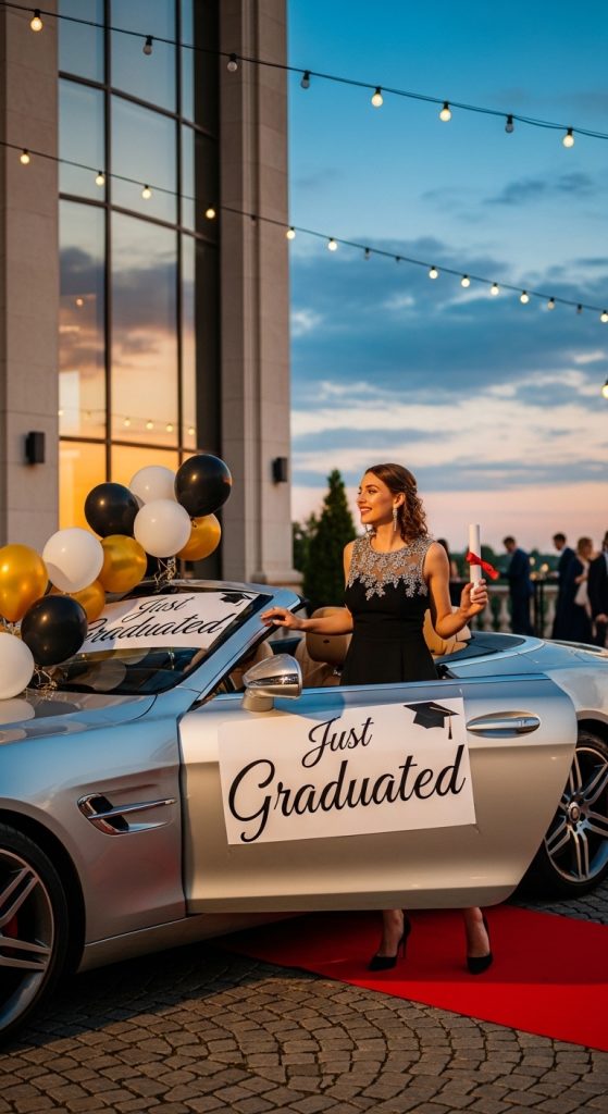 If a luxury car rental isn’t in your budget, you can decorate a family car with balloons, streamers, and “Just Graduated” signs to create a festive version of the same concept.