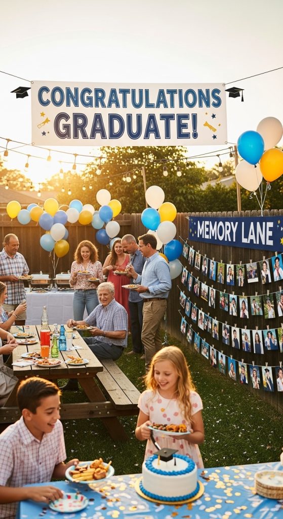 Create a “Memory Lane” photo gallery that highlights the graduate’s journey. Include photos from childhood, school events, extracurricular activities, and trips with friends and family. You can arrange the photos chronologically along a hallway or a designated area at the party. Guests can contribute by writing short notes or memories beside each photo. This visual timeline not only sparks conversation but also creates a nostalgic and heartwarming experience for everyone.