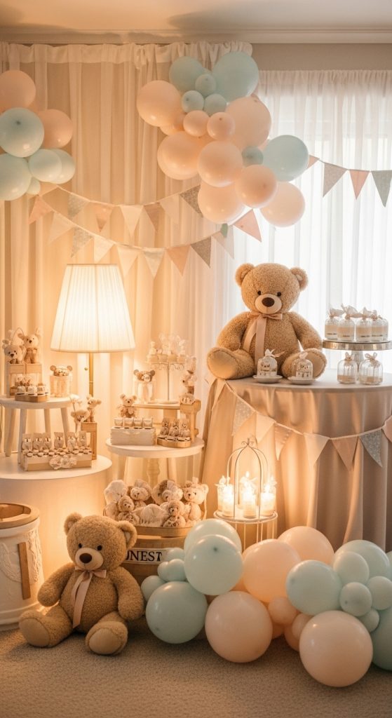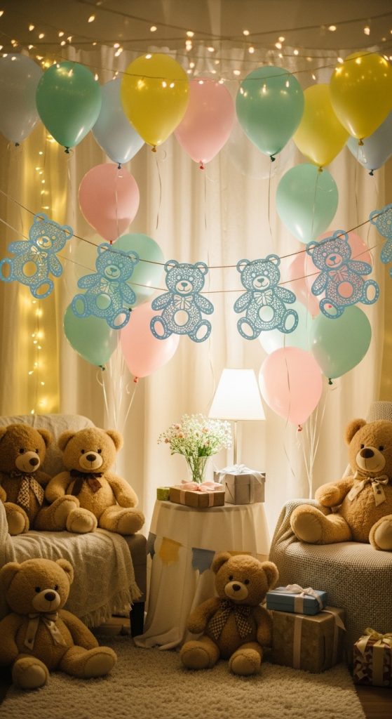 Decorate the venue with cozy bear-inspired touches. Hang banners with teddy bear motifs, use pastel-colored balloons in soft hues, and scatter plush bears around the room. You can also place bear-shaped cutouts on chairs, walls, and the gift table. The goal is to create a warm, inviting space that reflects the comforting essence of a teddy bear.