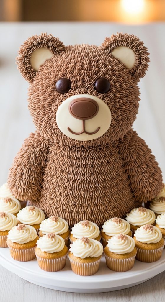 No baby shower is complete without delicious treats, and a teddy bear cake is always a showstopper. Opt for a cake shaped like a bear, decorated with soft icing in shades of brown, cream, or pastel colors. Complement the cake with bear-shaped cookies, cupcakes with little bear toppers, and chocolate bears for a sweet, cohesive dessert table that guests will adore.