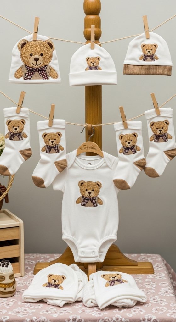 Celebrate the baby with a teddy bear clothing display. Hang tiny bear-themed onesies, socks, and hats on a decorative clothesline or a mini stand. Guests can admire the adorable outfits while the parents-to-be can pick their favorite ones. This display doubles as a charming décor element and a practical way to showcase thoughtful gifts.