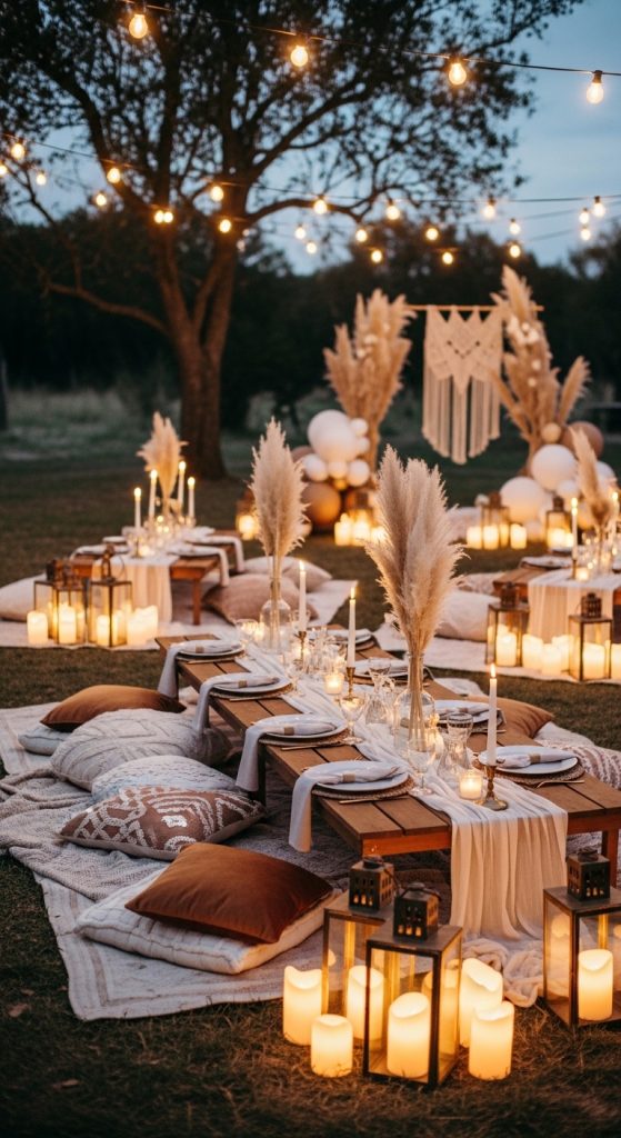 The warm glow of these lights enhances the cozy boho atmosphere and makes the celebration feel intimate and special.
