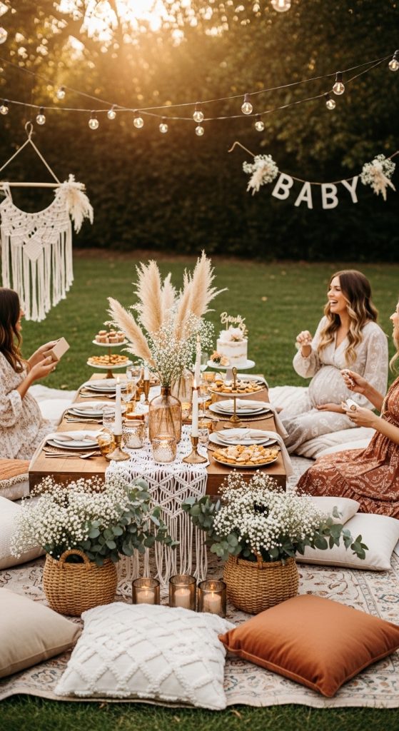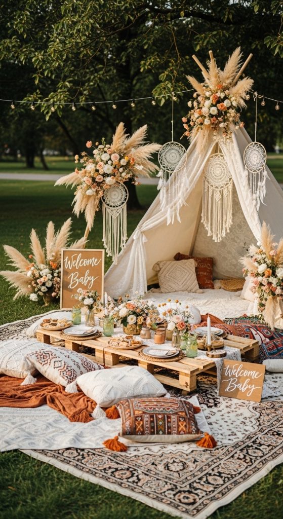 From pampas grass arrangements and teepee backdrops to rustic food displays and soft lighting, every detail contributes to the dreamy bohemian atmosphere. The key is to keep the setup comfortable, nature-inspired, and personal to the mom-to-be.
