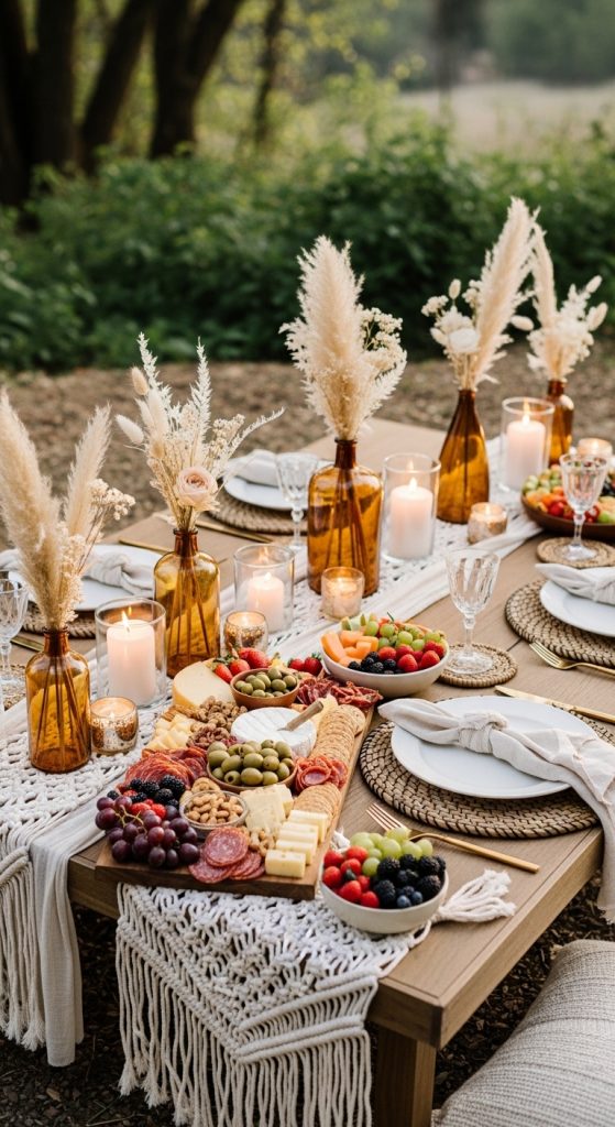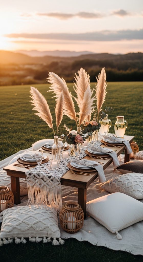 One of the signature elements of a boho picnic is a low table setup surrounded by floor seating. Instead of traditional tables and chairs, use wooden pallets or short tables placed on rugs or blankets.