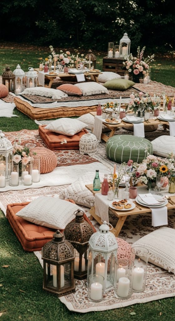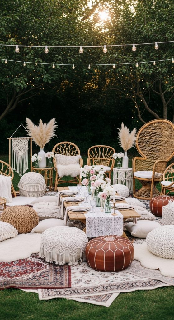 Add floor cushions, poufs, and layered rugs around the table so guests can sit comfortably. This setup creates a cozy and stylish gathering area that immediately sets the boho mood.