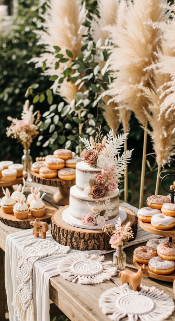 Keeping the dessert colors soft and natural—such as beige, blush, sage, and cream—helps maintain the bohemian theme.