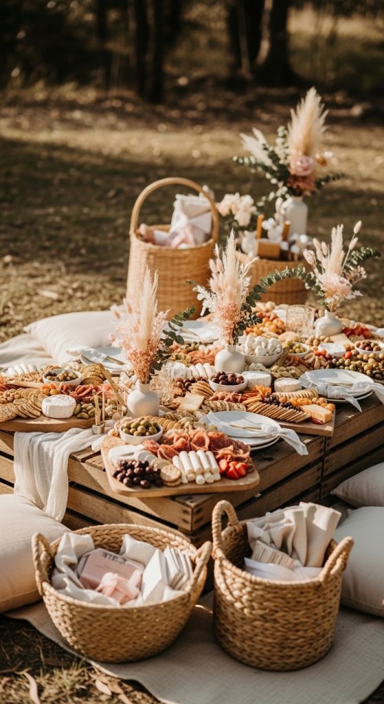 Instead of a traditional buffet table, create a rustic food display using wooden crates, trays, and tiered stands. Arrange them on a picnic table or blanket.