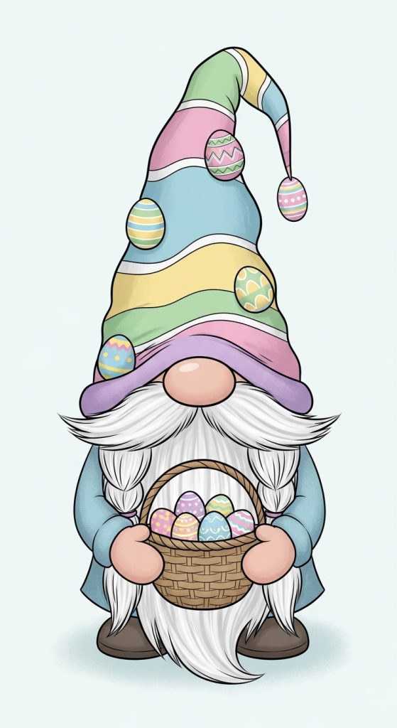 A typical Easter gnome design may include a fluffy beard, a round nose, and a hat pulled low over the eyes. The gnome might hold a carrot, an egg, or a small basket.