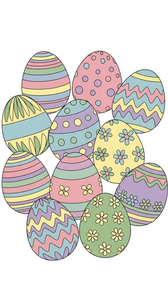 A collection of decorated eggs works well for background patterns, borders, printable decorations, and craft templates. Designers often create multiple eggs in different colors to build a festive Easter set.